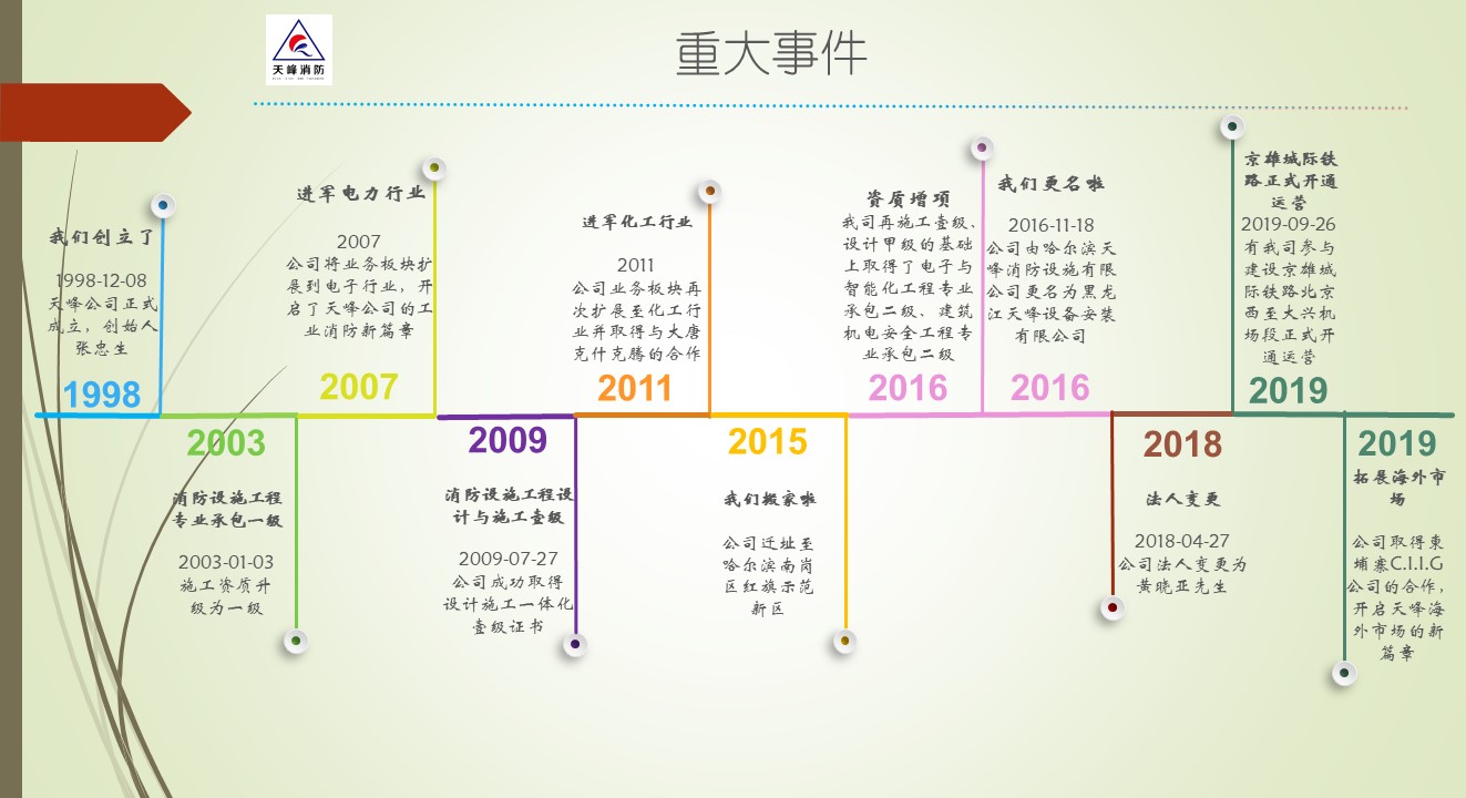 黑龍江天峰設備安裝有限公司(以下簡稱:天峰消防)創立于1998年,主要承接能源化工、石化、電力、軌道交通、冶金、城市管廊等工業行業消防系統工程,可為客戶提供特殊消防系統的詳細設計、供貨、施工等集成服務,天峰消防將依靠自身實力和信譽實現“立足龍江,布局全國,走向海外”的目標。